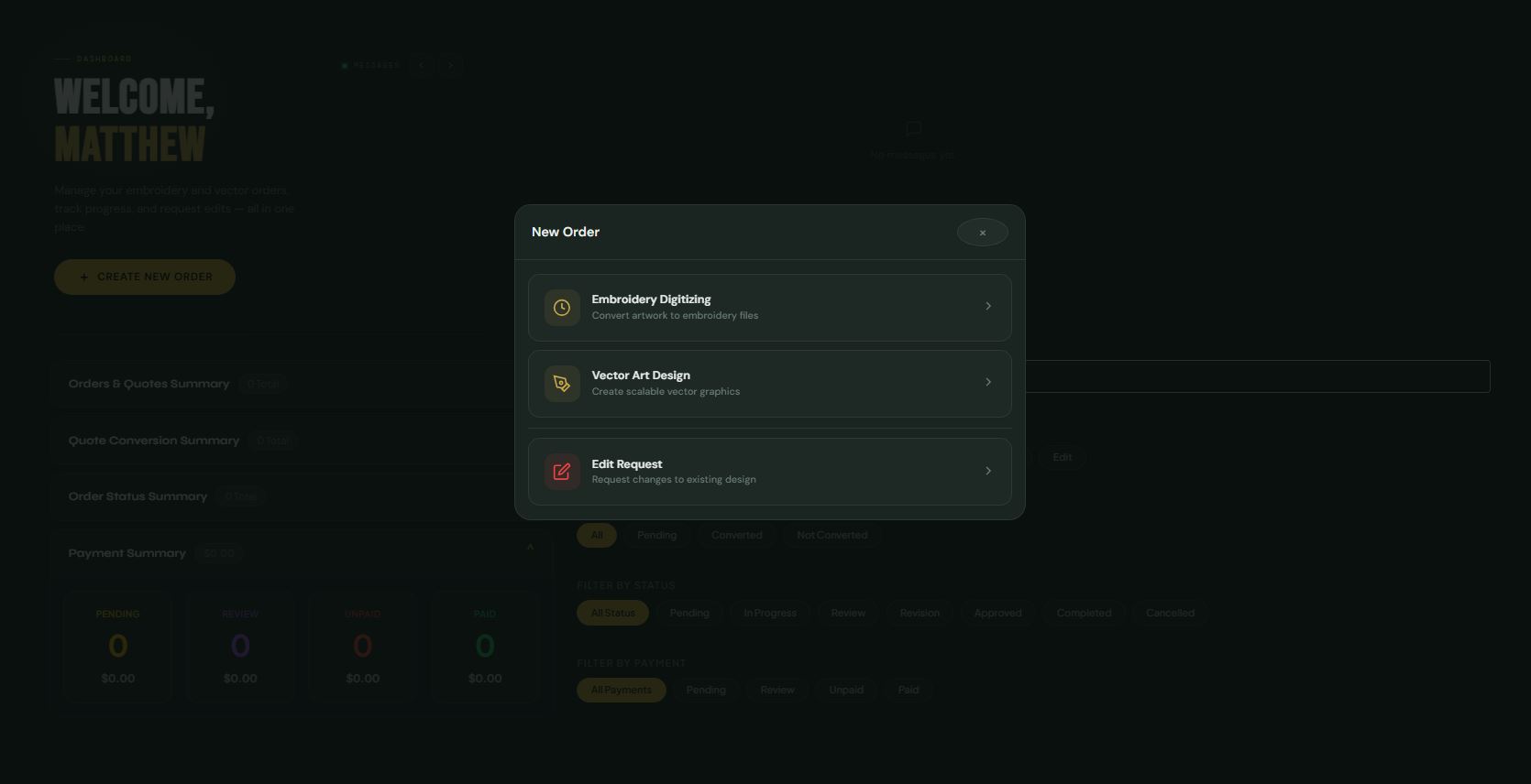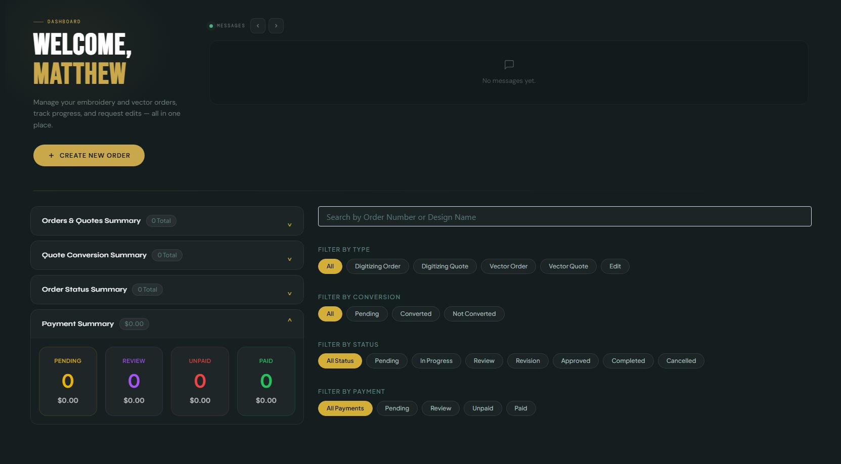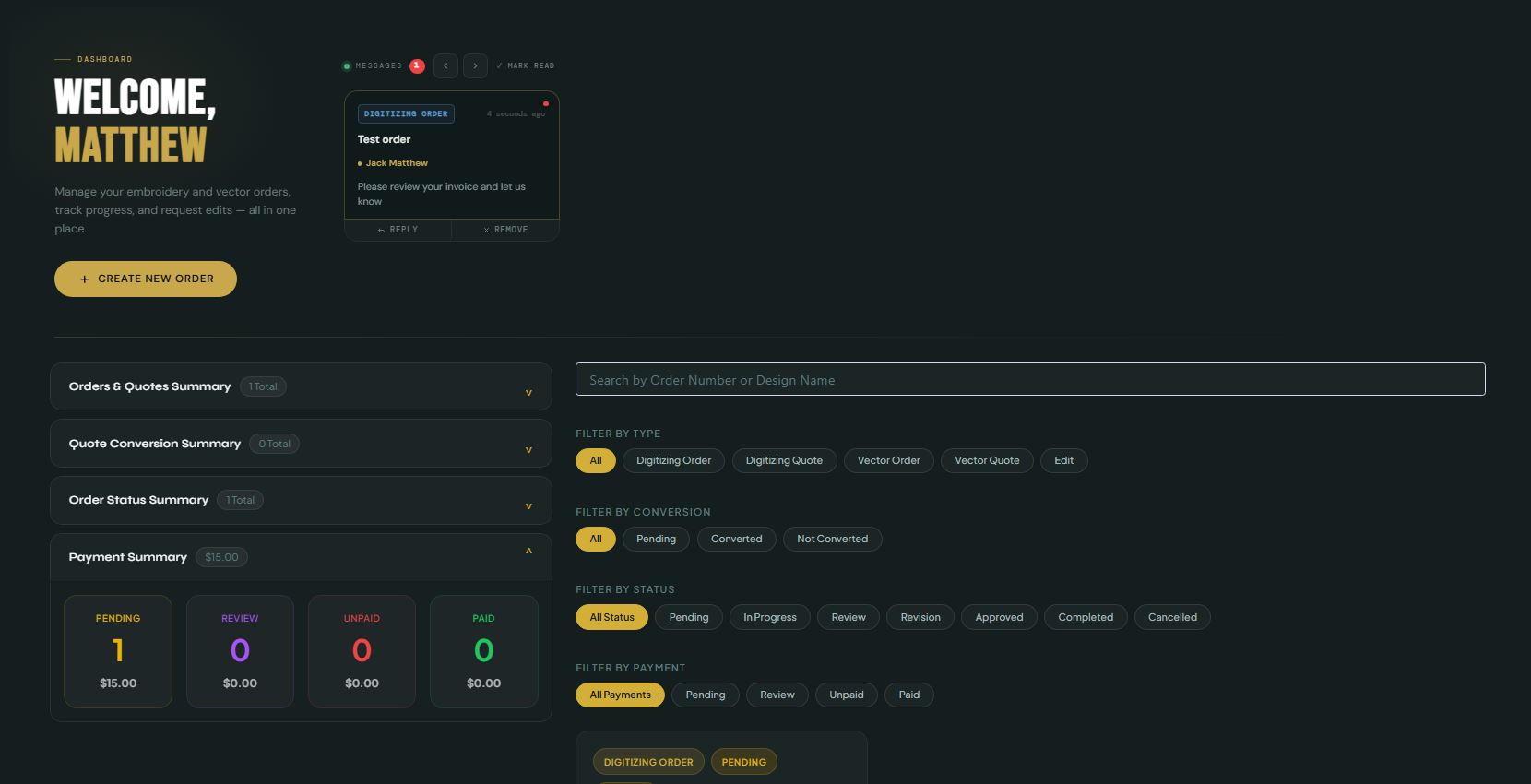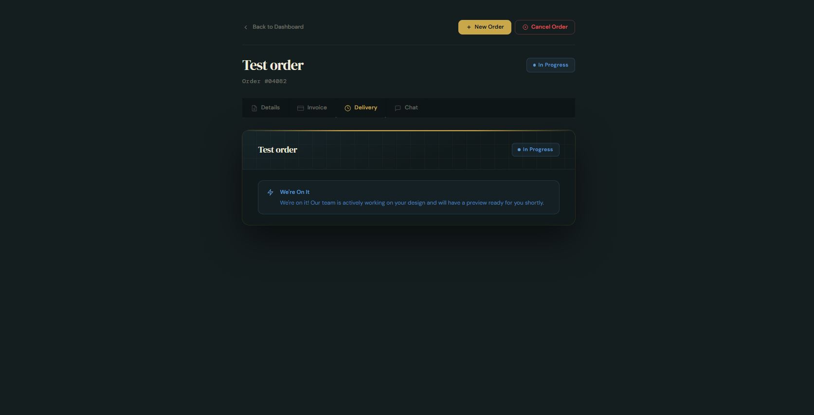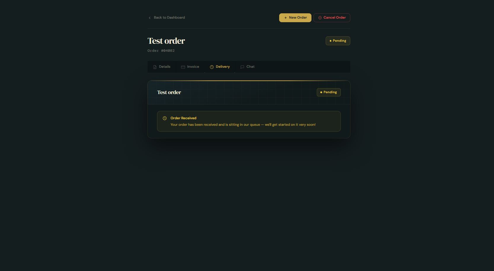 Every order, file, message, and payment — tracked in one place. No email chains. No chasing vendors. Just a clean dashboard that shows exactly where things stand.